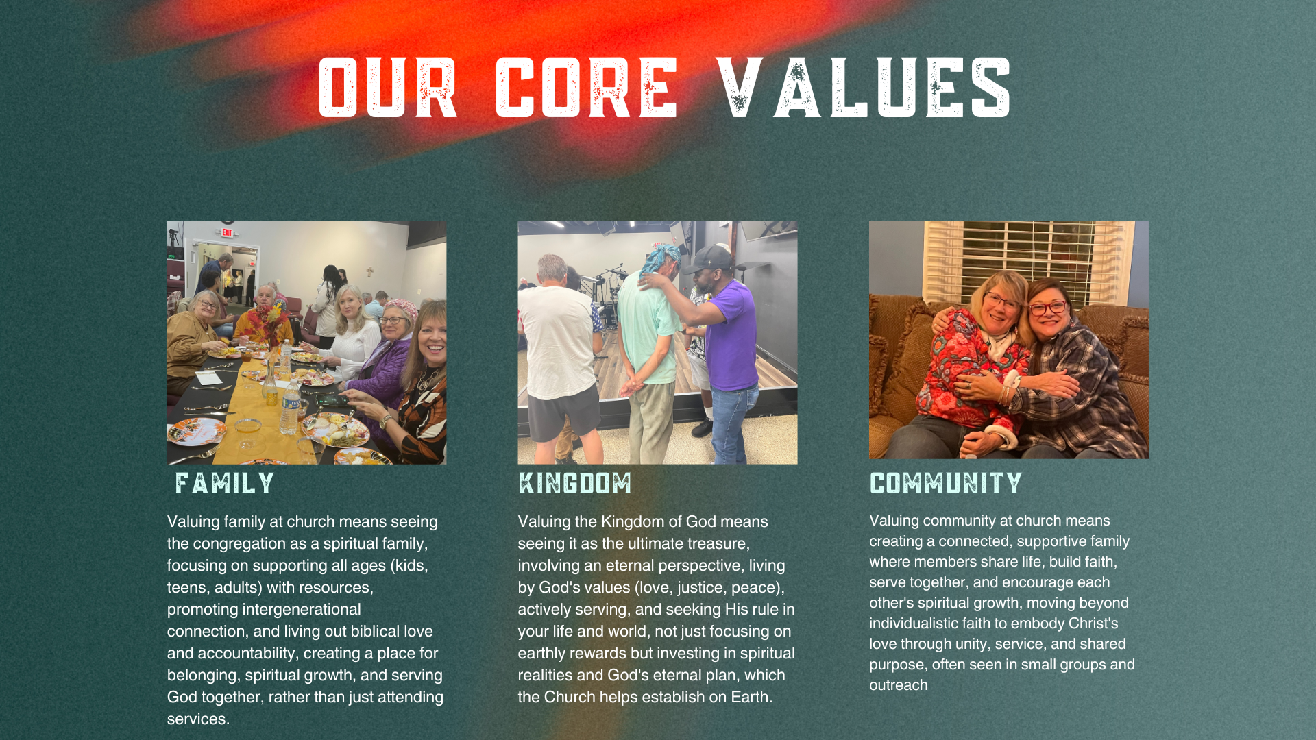 The values of family, kingdom, and community represent our core identity as a church. These principles are the foundation of how we connect, shaping a culture where each person feels valued and supported. Rooted in spiritual traditions, these values emphasize the importance of belonging to a nurturing body that encourages shared purpose and genuine relationships. By embracing family, kingdom, and community, we foster an environment where individuals can thrive together, guided by a sense of higher purpose and unity.
